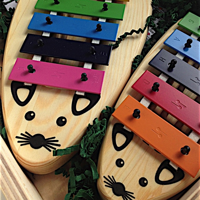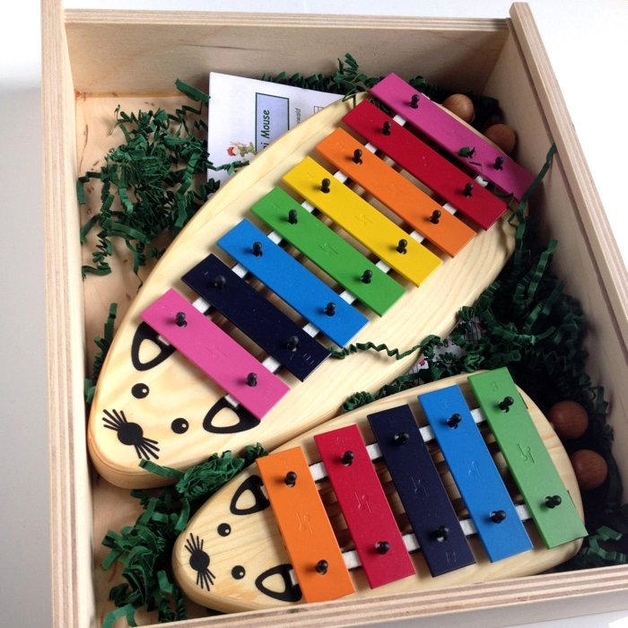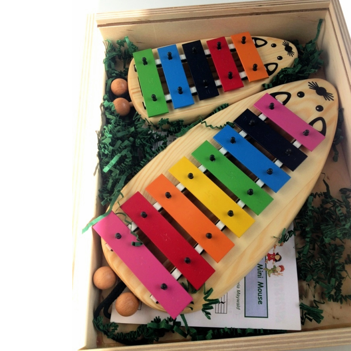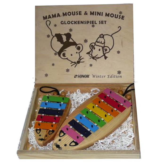 Sopranklokkespil udformet som en sød mus med ører, næse og mund. Instrumenterne har henholdsvis 5 og 8 toner i forskellige farver. Krop af træ. Der medfølger to køller af træ til at spille med.