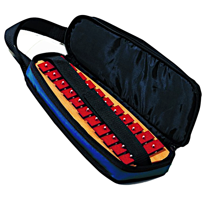 Regntæt taske, som beskytter klokkespillet godt med tykke skumsider. Der er lommer og løkker til køller og ekstra-stave. Tasken har håndtag og lukkes med lynlås.