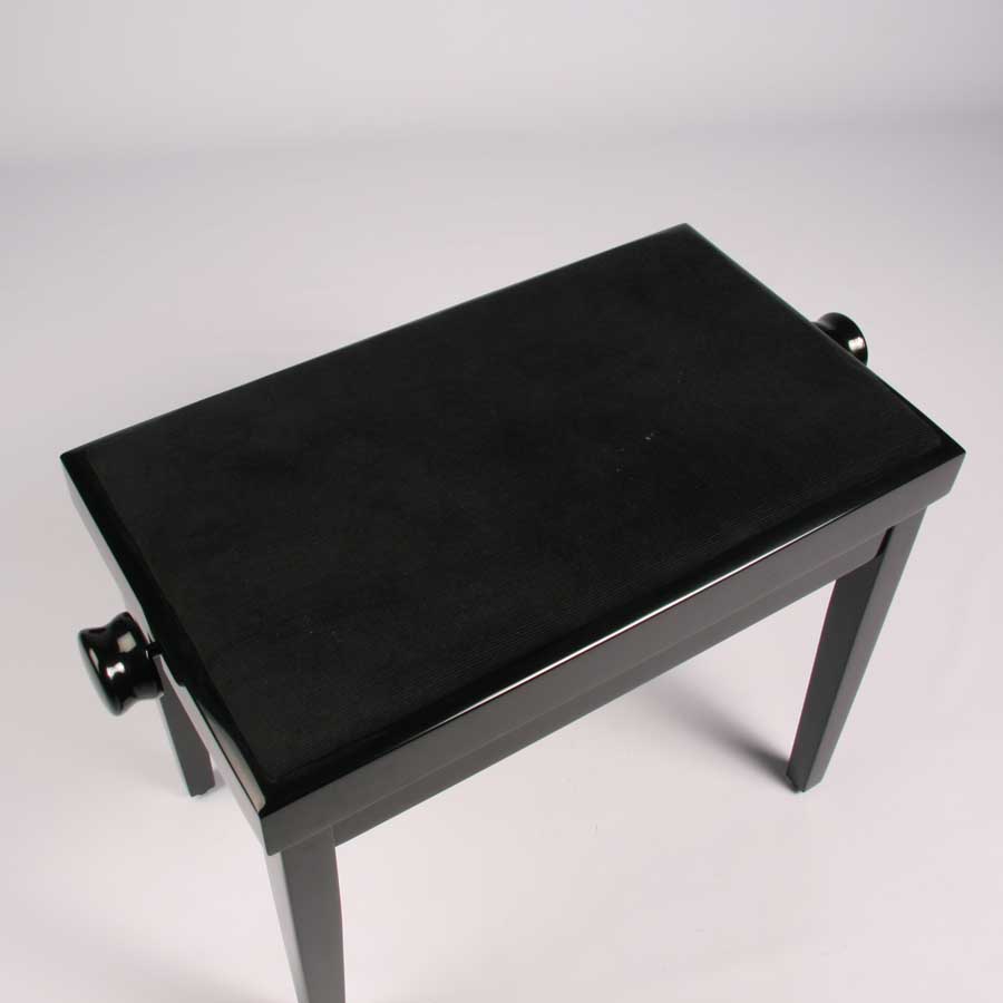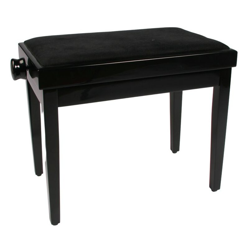 Klaver- og keyboardbænk. Klassisk designet klaverbænk. Variabel højde. Sort med Hi-gloss finish. Finish: Sort, højglans pianolak. Matchende sort sæde af polstret, slidstærkt plyds. Massivt træ. Kraftige ben. Sædemål: 36 x 56 cm. Justerbar højde med kraftig metal-spindel. Trinløs højde 46-54 cm.