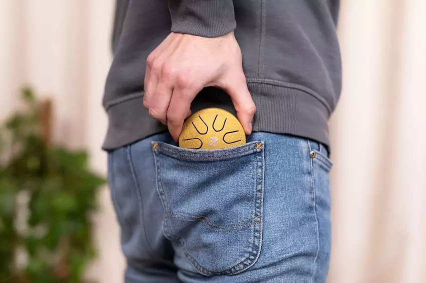 Sød lille lomme steel drum som du kan tage med og spille på når du har lyst.
