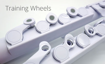 NUVOS training wheels er en hjælp til de mindste elever, der har svært ved at lukke hullerne på jSaxen. Cap’en sættes oven på hullet på klappen, så man blot skal trykke klappen ned uden at tænke på at dække hullet.