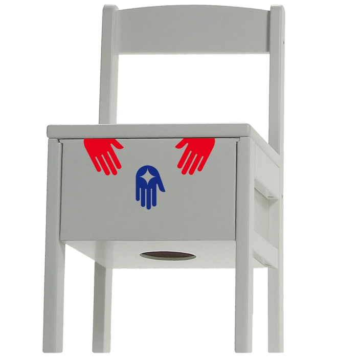Børnestol med aftagelig tromme under sædet. Trommen er en lille cajon, som man kan skyde ind under stolesædet.