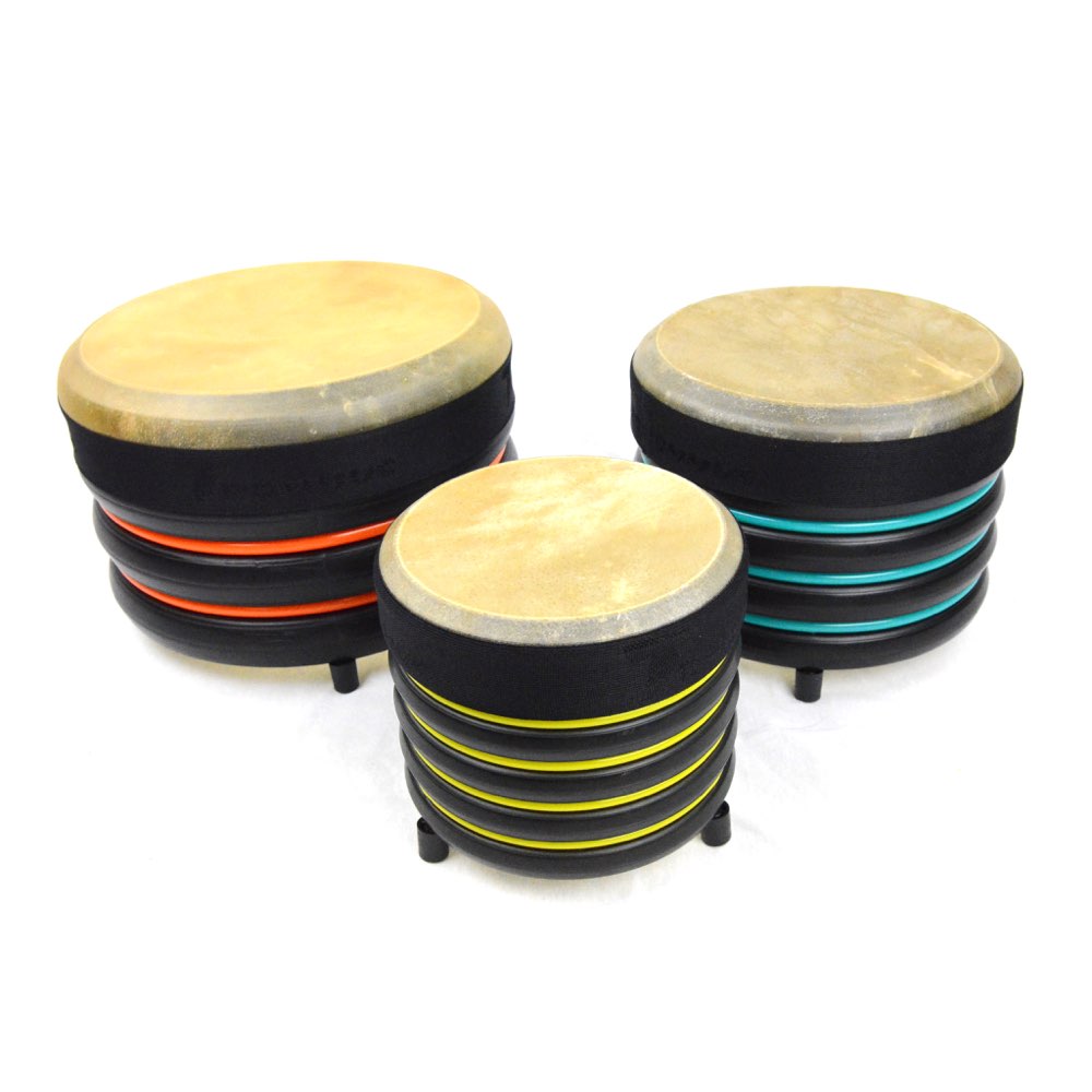 Trommerne kan stå på gulvet, holdes i hånden eller under armen. De er lette, men meget robuste og egner sig rigtig godt til børn. Kroppen er af plast med farvede striber og kan også bruges som guiro eller til at slå på. Slagfladen/trommehovedet er af naturskind.