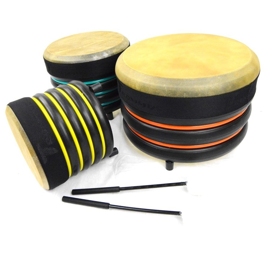 Trommerne er populære til rytmik, men også til musikleg i hjemmet. De kan nemt stables på tværs af størrelser, da de passer ind i hinanden. Kanterne er afrundede uden skarpe hjørner, og de er bløde og behagelige at holde på.