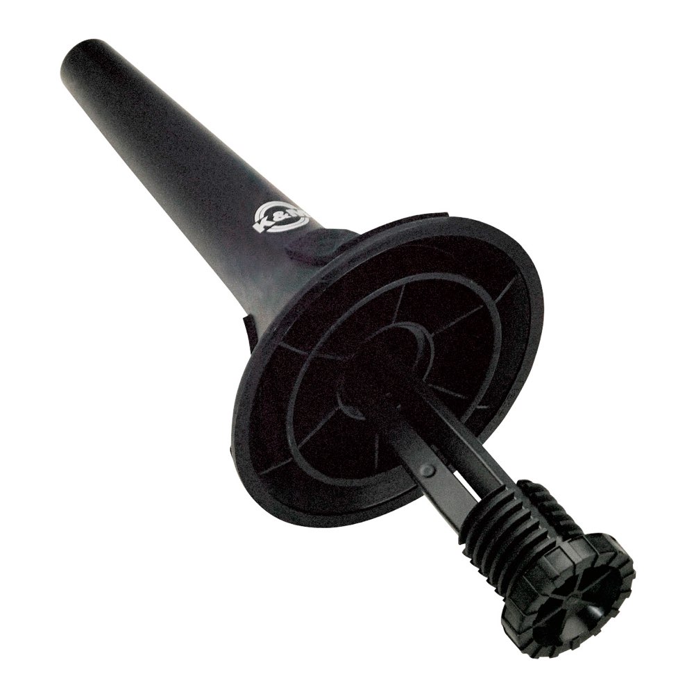 Sort plastikpind med filtpuder for at beskytte instrumentet. Aftagelig metalbenbase skrues ind i tappen, så hele enheden kan opbevares i instrumentklokken for nem transport.