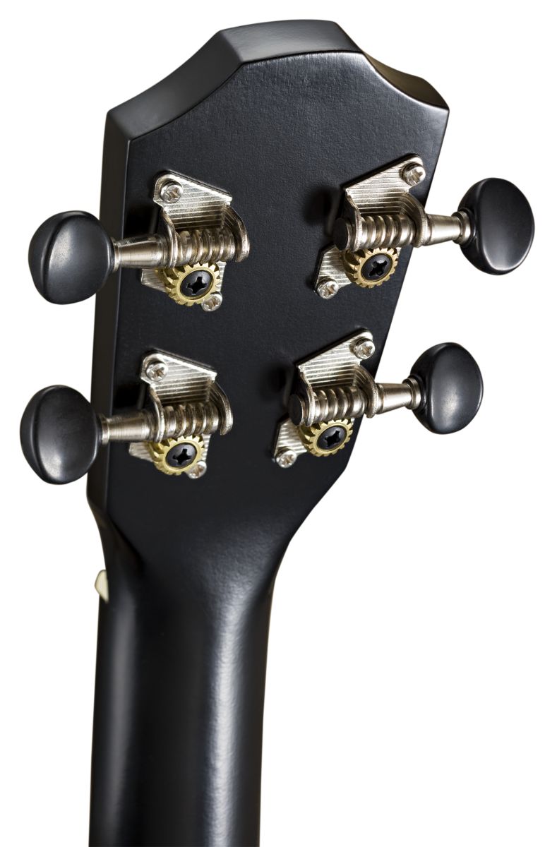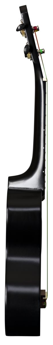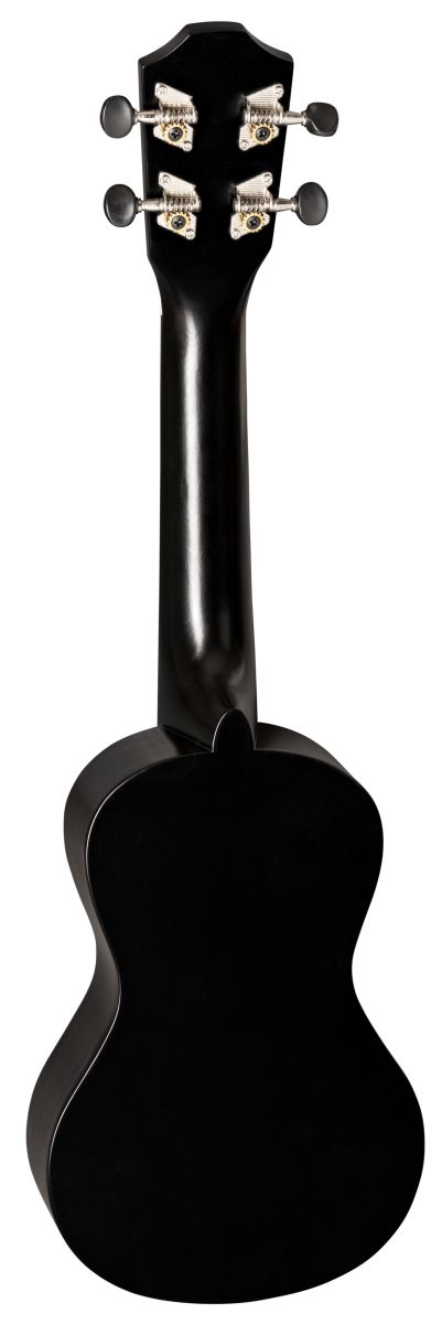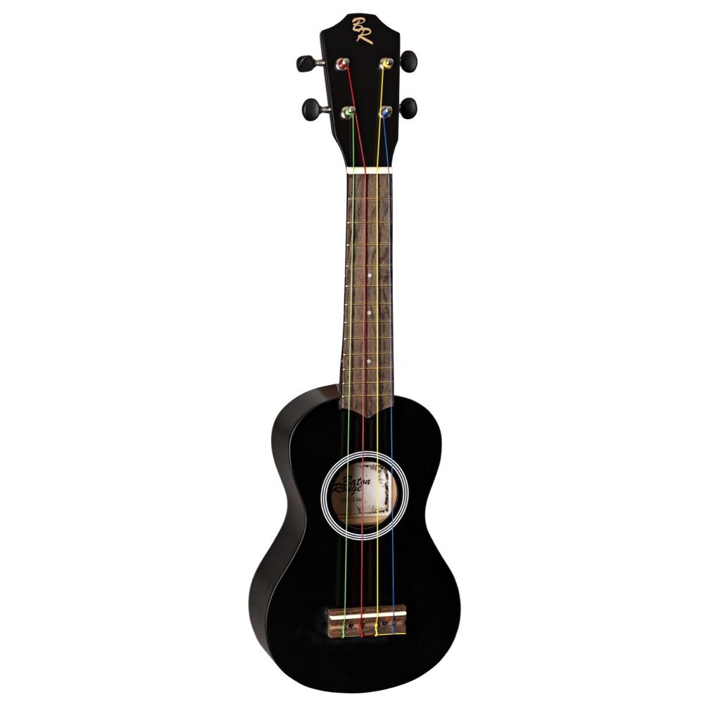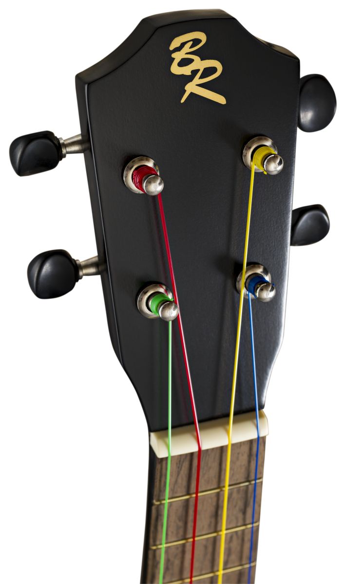 En fin ukulele i sort træ med farvede strenge (Boomwhackersfarver). Gode materialer og et godt begynderinstrument. Produceret af tyske Baton Rouge.